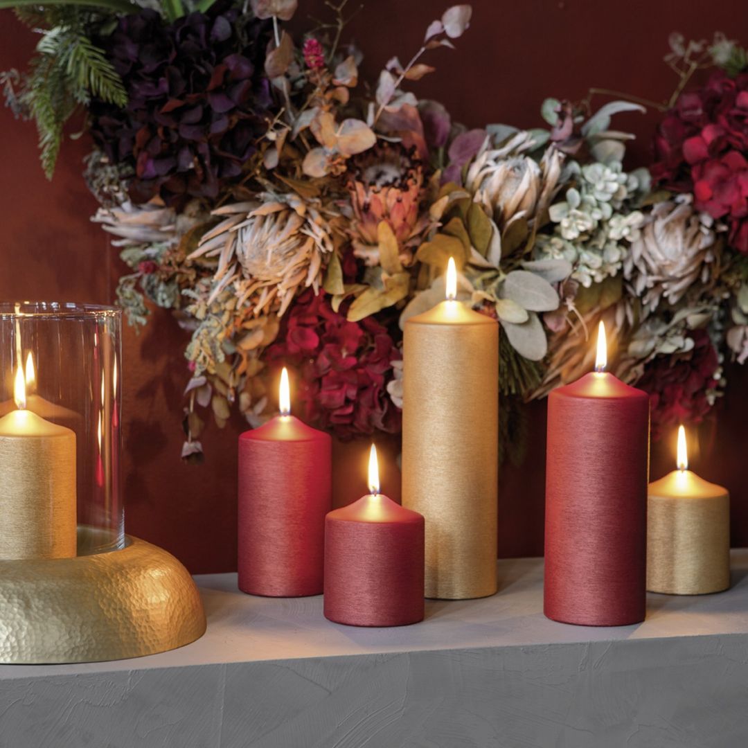 Faszinierende Effekte lassen sich im Handumdrehen mit Kerzenlicht erschaffen. Ob in Laterne, Windlicht oder einem opulenten Halter: Kerzenlicht hat das ganze Jahr über Saison und schafft immer ein festliches Ambiente. Und wenn es einmal ganz besonders glamourös werden soll, sorgen unsere Kerzen für das entscheidende Detail. Diese duftneutralen Stumpenkerzen besitzen eine schimmernde Oberfläche, versprechen eine lange Brenndauer und ein ruhiges und einwandfreies Abbrennen. Arrangieren Sie phantasievolle Lichterinseln und kreieren Sie stimmungsvolle Wohnakzente auf Tafel, Anrichte und Wohnzimmertisch. Wir bieten Ihnen eine große Auswahl an verschiedenen Farben, so finden Sie die perfekte Kerze für Ihren Einrichtungsstil.